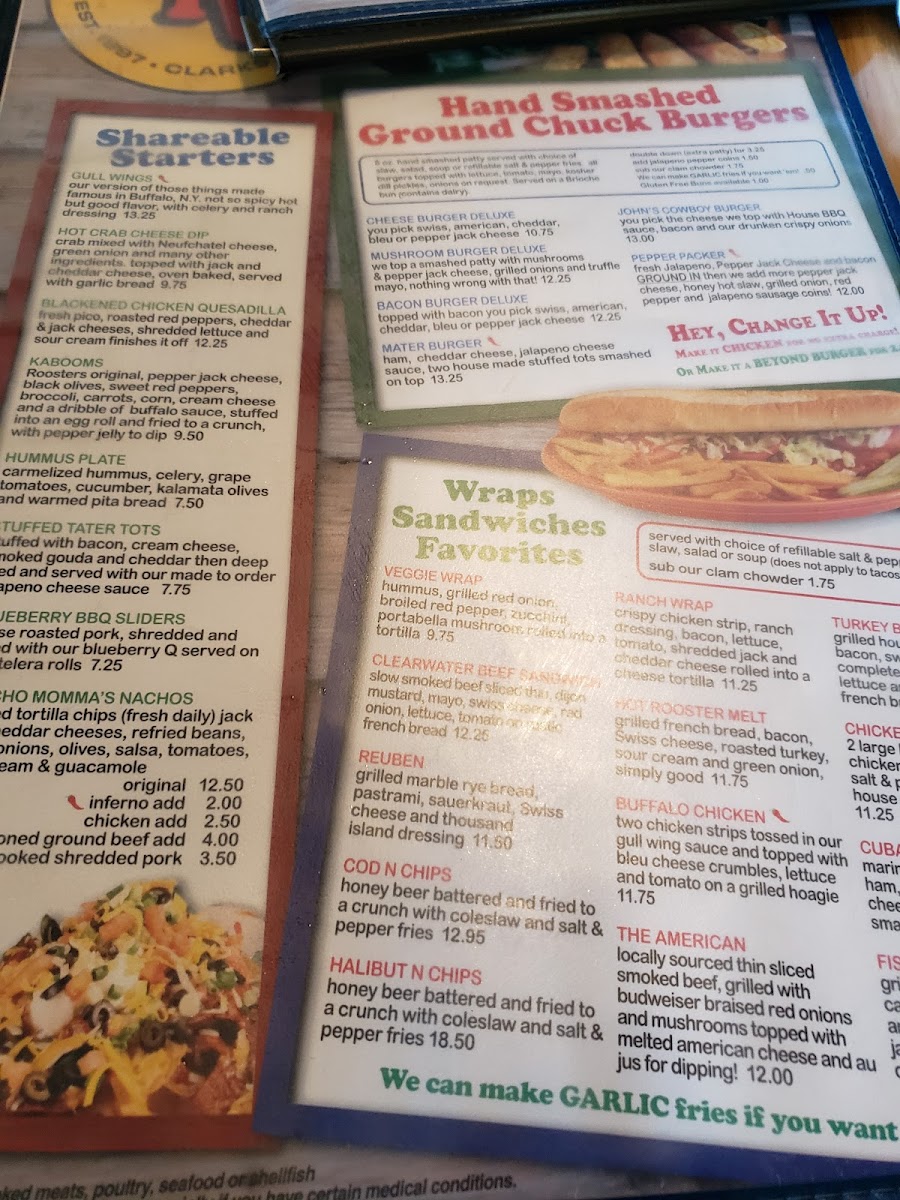 At Roosters Waterfront Restaurant, the menu offers a delightful blend of flavors inspired by fresh ingredients and creative dishes. Whether you're in the mood for a hearty seafood dish, a juicy steak, or a light appetizer, there's something to satisfy every craving. The Roosters Waterfront Restaurant Menu features a variety of options that cater to diverse tastes, all served with a side of stunning waterfront views. Start your meal with a crispy calamari or a rich, creamy chowder, and dive into main dishes like perfectly seared salmon or a tender filet mignon. Don’t forget to indulge in the chef’s signature desserts to end your experience on a sweet note. Whether you're here for a casual dinner with friends or a special celebration, the menu promises a satisfying dining experience that will keep you coming back for more.